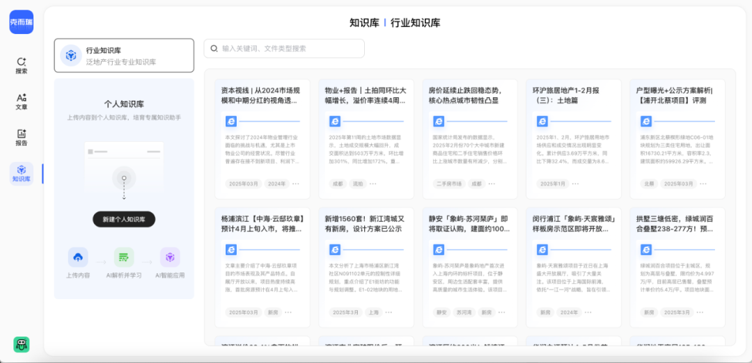 克而瑞AI Agent整合了积累多年的知识库(RAG)体系,其中包括海量的各类文献、稿件、报告,以克而瑞自主研发的AI模型进行分类、归纳、学习成为文章和报告撰写等工作成果输出的另一个专业准确性保证。克而瑞AI还支持用户创建自己的知识库。用户上传自己资料信息后,系统将自主学习用户的写作风格,适配其写作习惯,从而生成更符合个性需求的报告和文章。