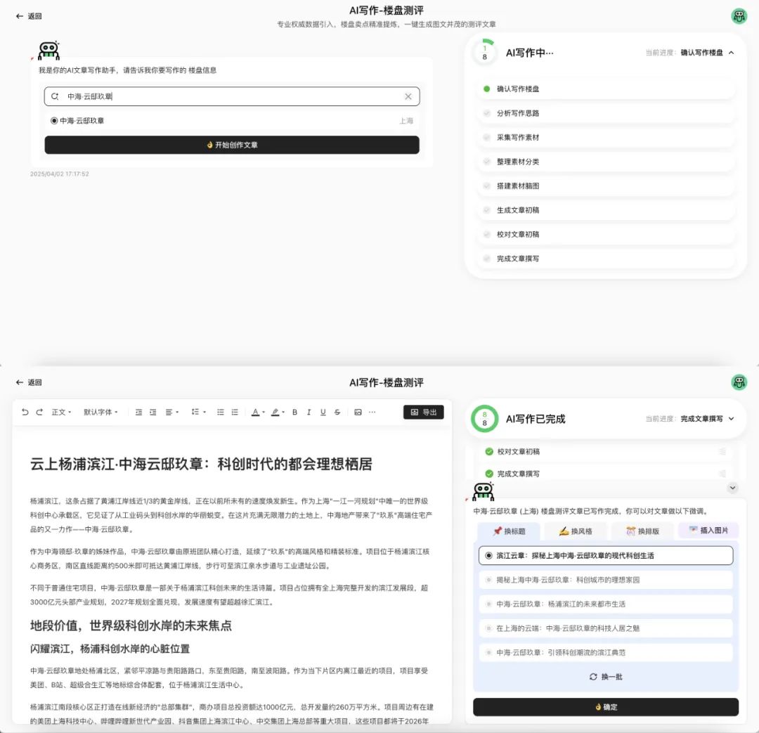 克而瑞AI Agent支持丰富的文章创作类型,如楼市测评、地块解读、政策分析等,覆盖住宅、购物中心、二手房、家居建材等多个细分领域。克而瑞AI Agent按照创新设计的不动产行业写作工作流(Workflow)自主执行,并会自主判断调用克而瑞数据库及RAG知识库,以确保文章专业度及准确度。期间用户可以随时调整写作思路进行在线修改,还可以通过AI调整文风、重画图表,同时也支持一键导出,进行线下润色。