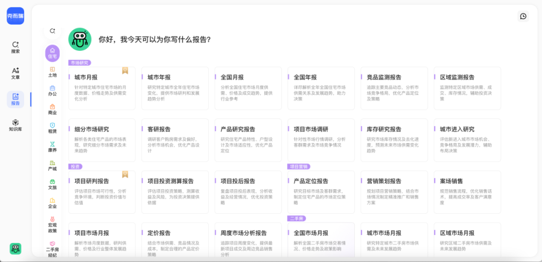克而瑞AI Agent结合克而瑞二十余年的行业报告及撰写经验进行深度训练,克而瑞AI支持针对住宅、土地、办公、商业、租赁、康养、产城、文旅、企业、宏观政策等各细分领域专业研究报告的撰写,无论是区域市场月报、全国年度报告还是做项目研判、土地投资测算都能智能高效完成。克而瑞AI可根据报告类型生成撰写大纲及逐页分析内容,并可自动在克而瑞数据库中调用所需数据,为用户生成外观考究、排版酷炫、图文并茂的作品。过程中,用户可以进行大纲结构与内容的调整,真正实现AI听从用户指令。