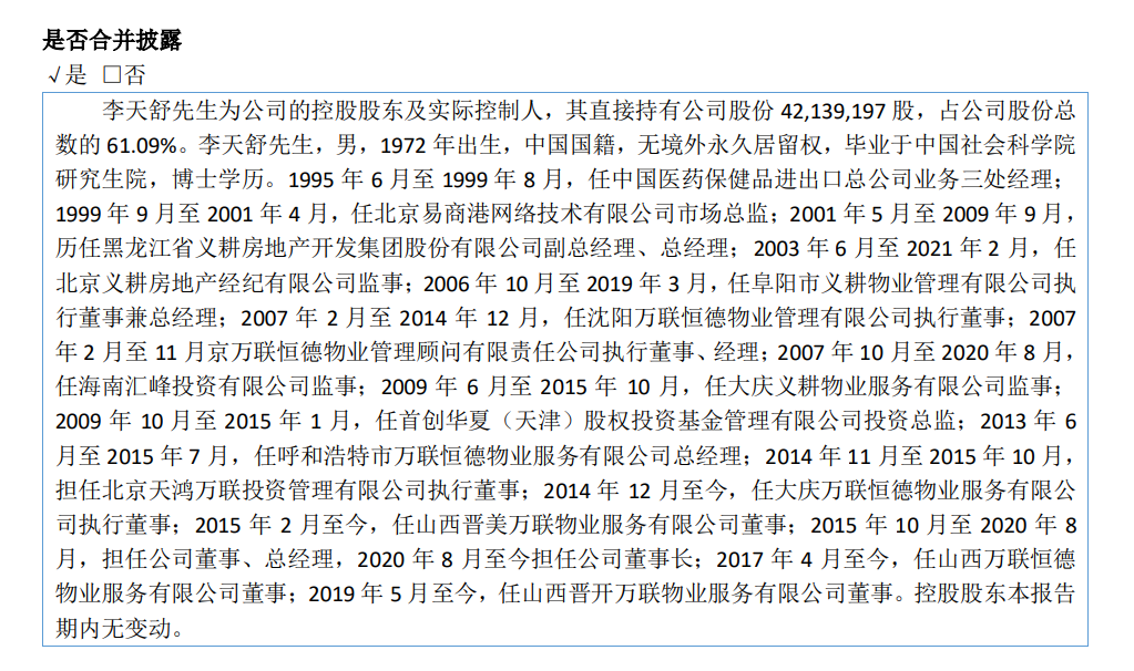 2014年12月至今,李天舒任大庆万联恒德物业服务有限公司执行董事;2015年2月至今,任山西晋美万联物业服务有限公司董事;2015年10月至2020年8月,担任公司董事、总经理,2020年8月至今担任公司董事长;2017年4月至今,任山西万联恒德物业服务有限公司董事;2019年5月至今,任山西晋开万联物业服务有限公司董事。