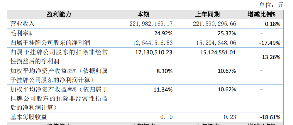 2024年,万联城服实现营业收入2.22亿元,比上年同期增加0.18%;营业成本1.67亿元,比上年同期增长0.79%;归属于挂牌公司股东的净利润1254.45万元,同比下降17.49%。