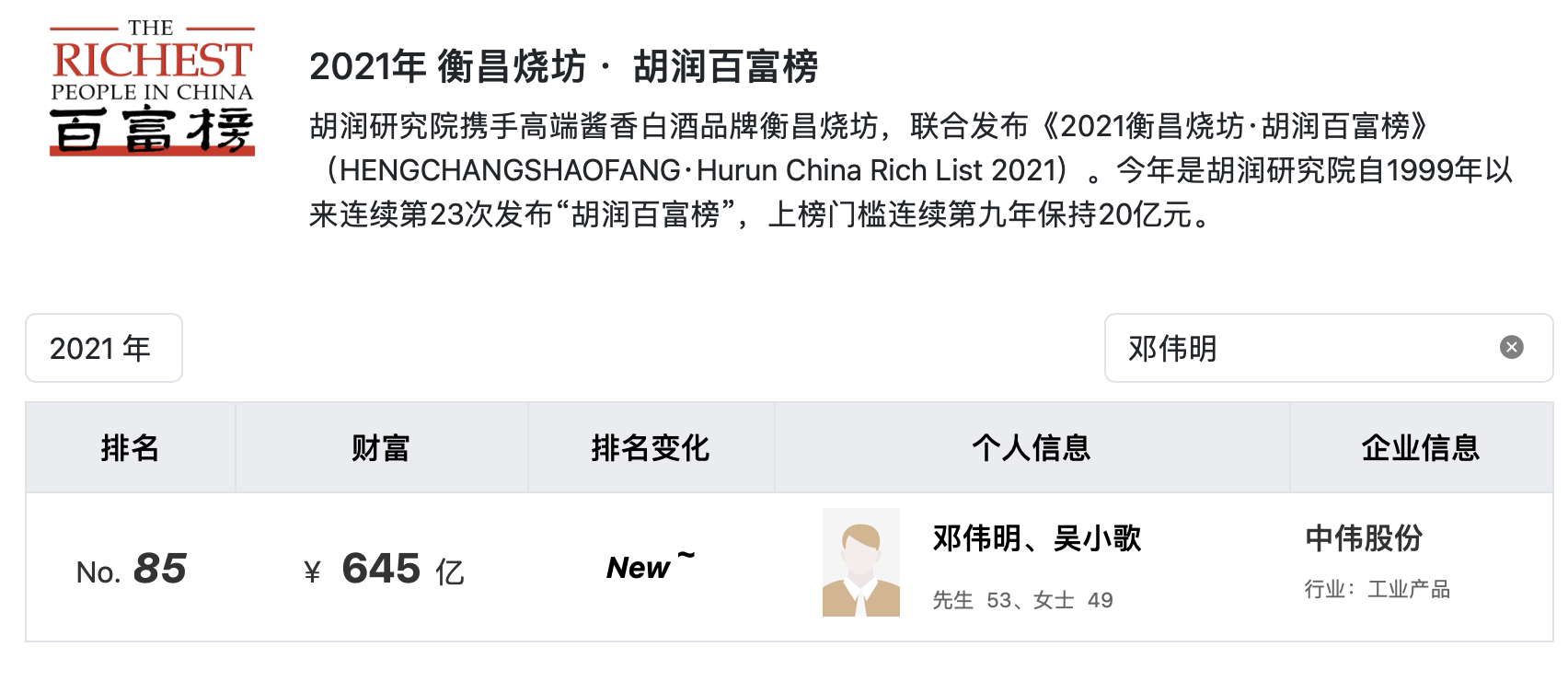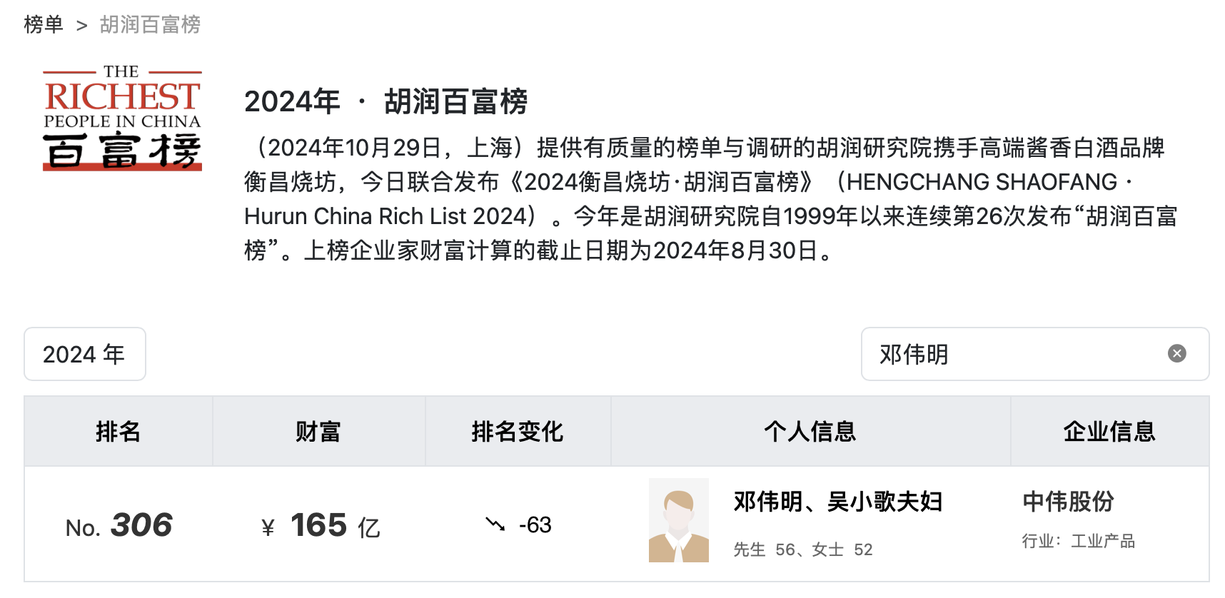 伴随公司股价上升,背后实控人邓伟明夫妇的财富水涨船高,坐上贵州首富的位置。2021年,他们以645亿元的财富位列胡润百富榜的第85名。2024年胡润百富榜上,邓伟明夫妇财富降至165亿元,较三年前缩水480亿元。