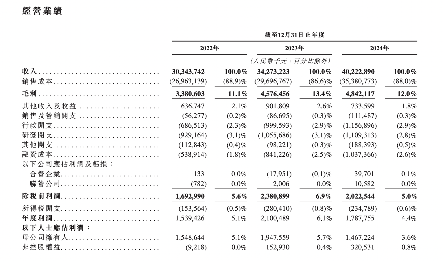 据招股书,2022年-2024年,中伟股份实现收入分别为303.44亿元、342.73亿元、402.23亿元;母公司拥有人应占利润分别为15.49亿元、19.48亿元、14.67亿元。