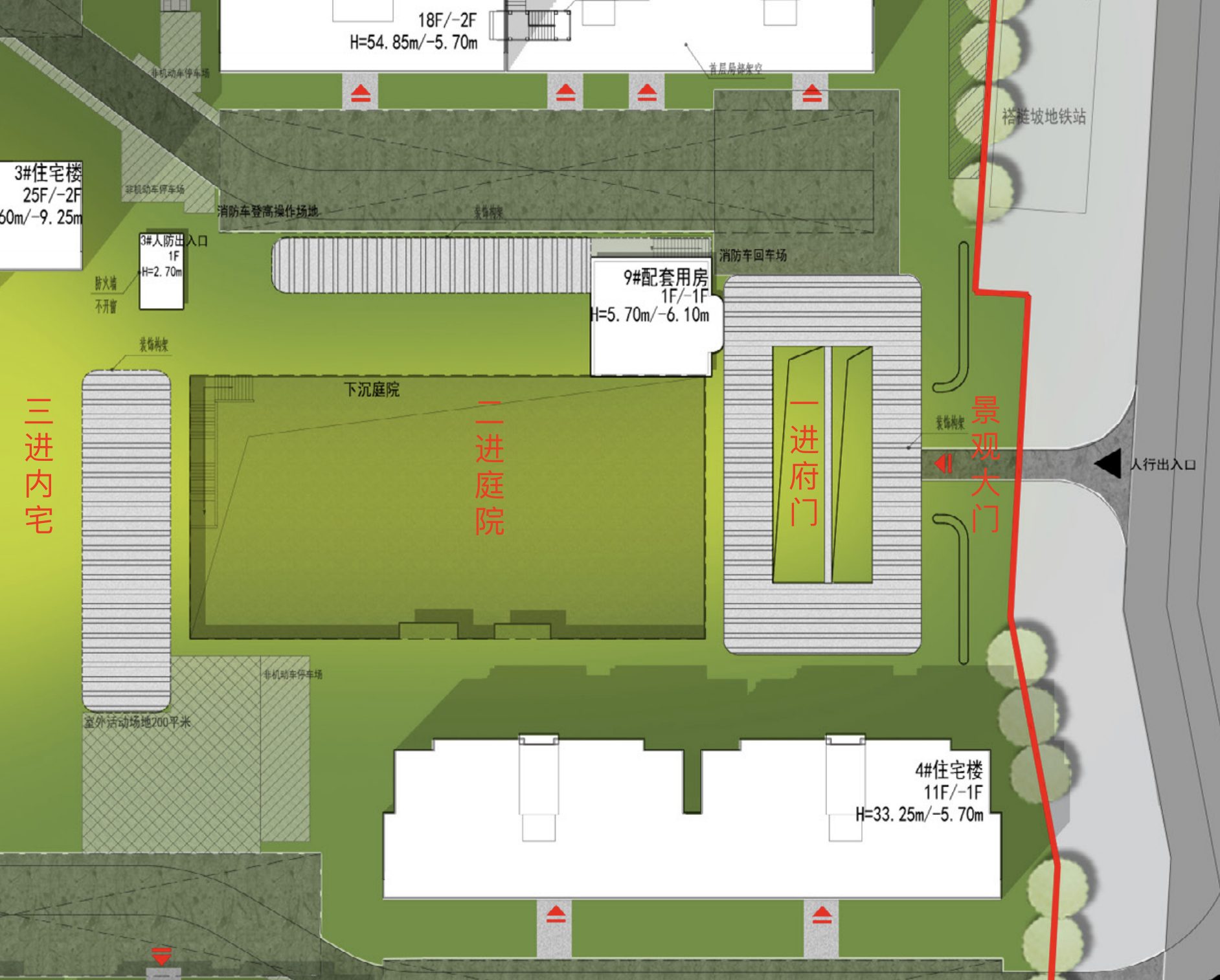一进社区大门;二进下沉庭院;三进内部住宅区域。