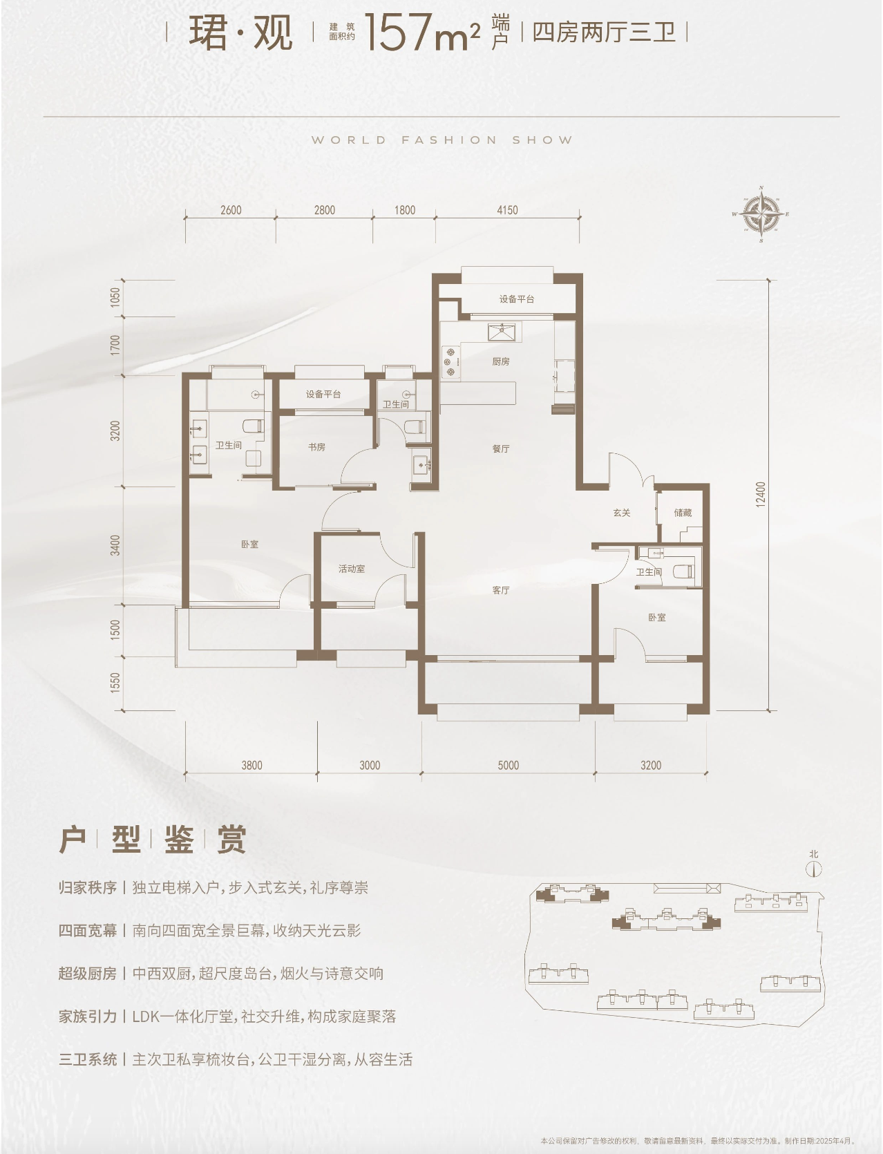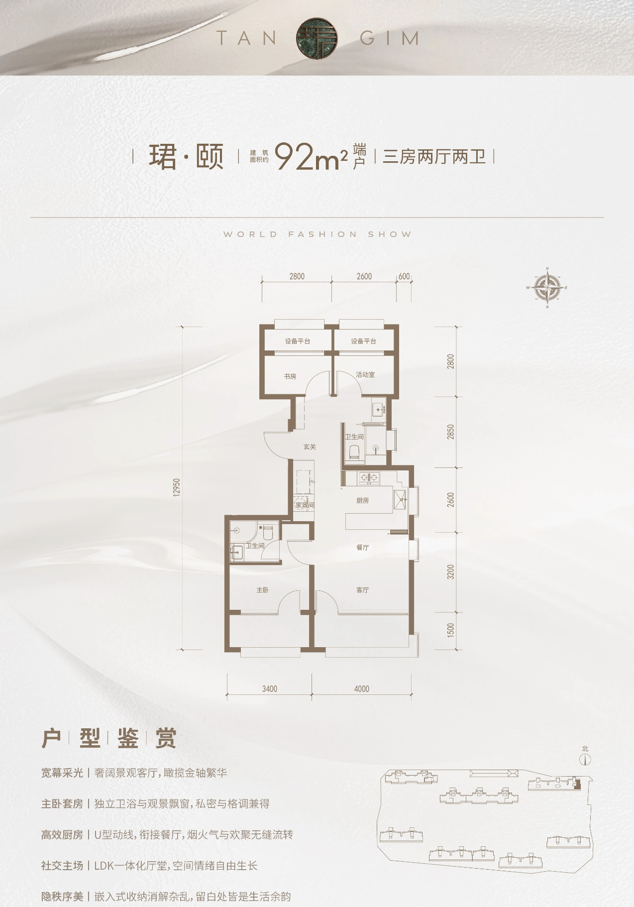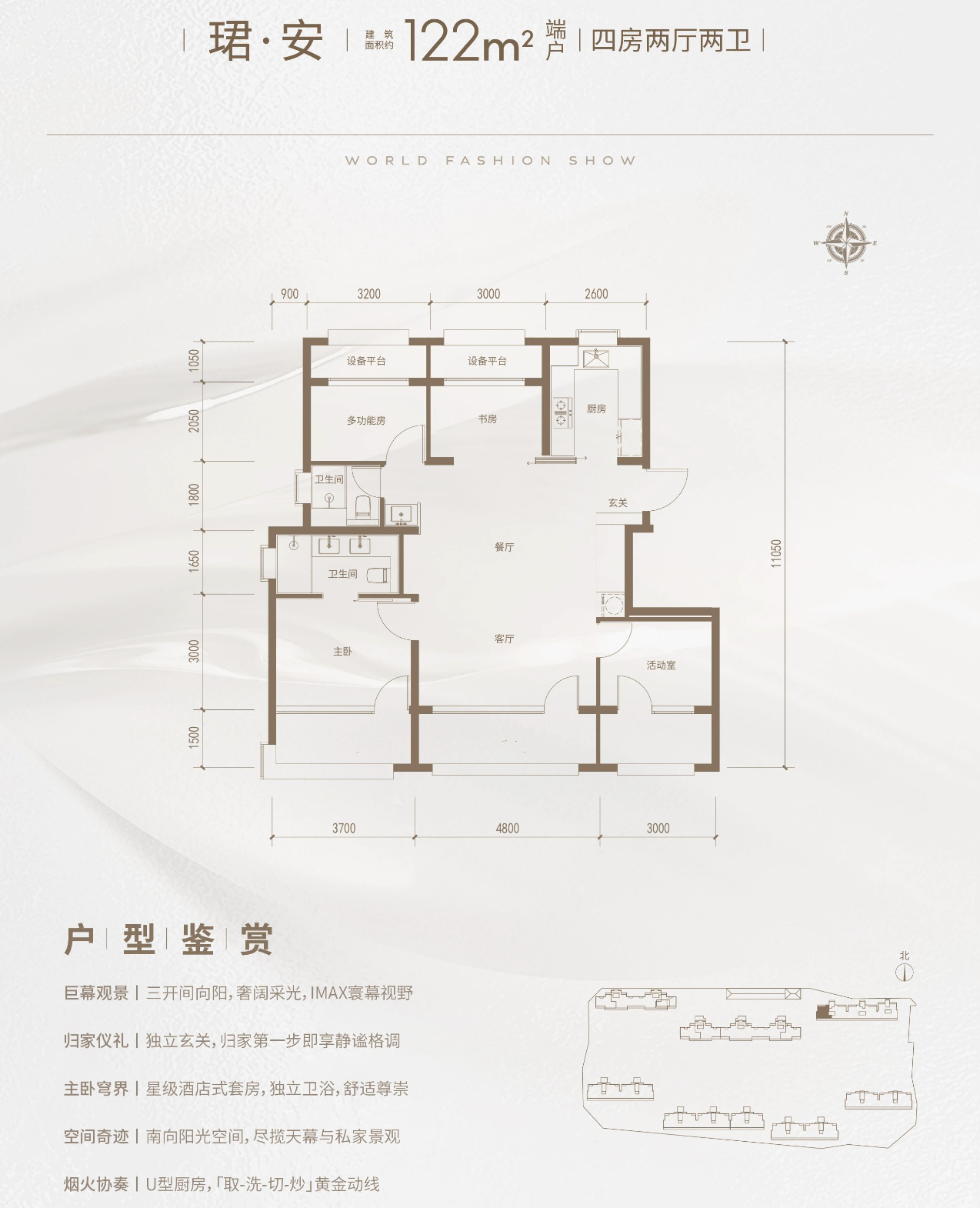 南向两面宽,客厅达到4米;南向1.5米深通面宽阳台,北向双卧室外接设备平台,南北、侧边均为飘窗设计。