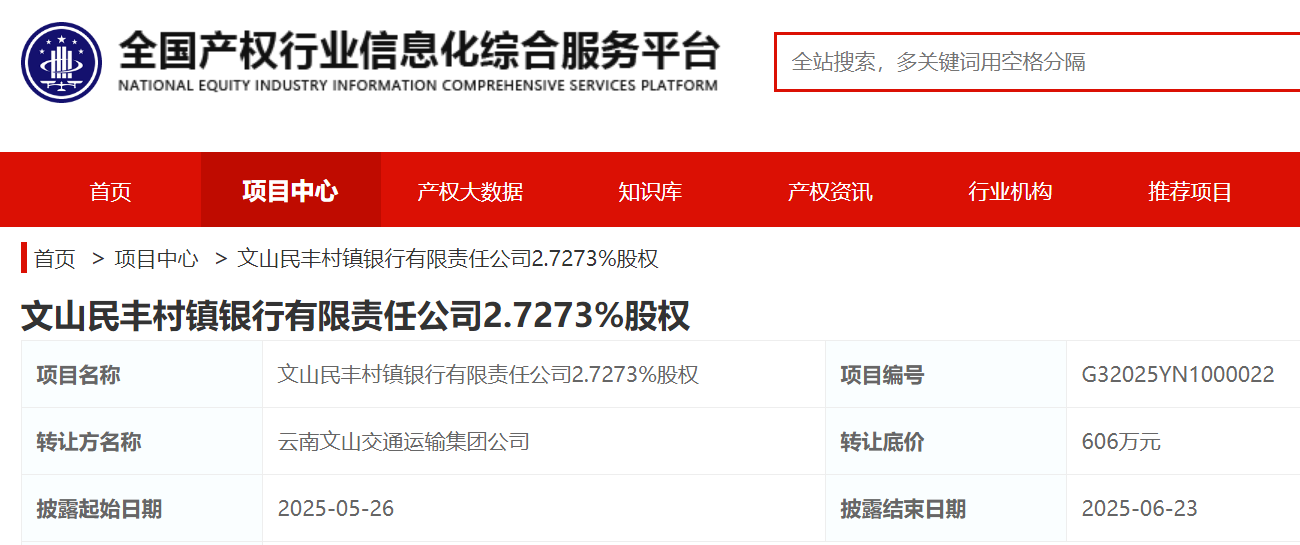 云南文山交运集团挂牌转让文山民丰村镇银行2.73%股权,底价606万元