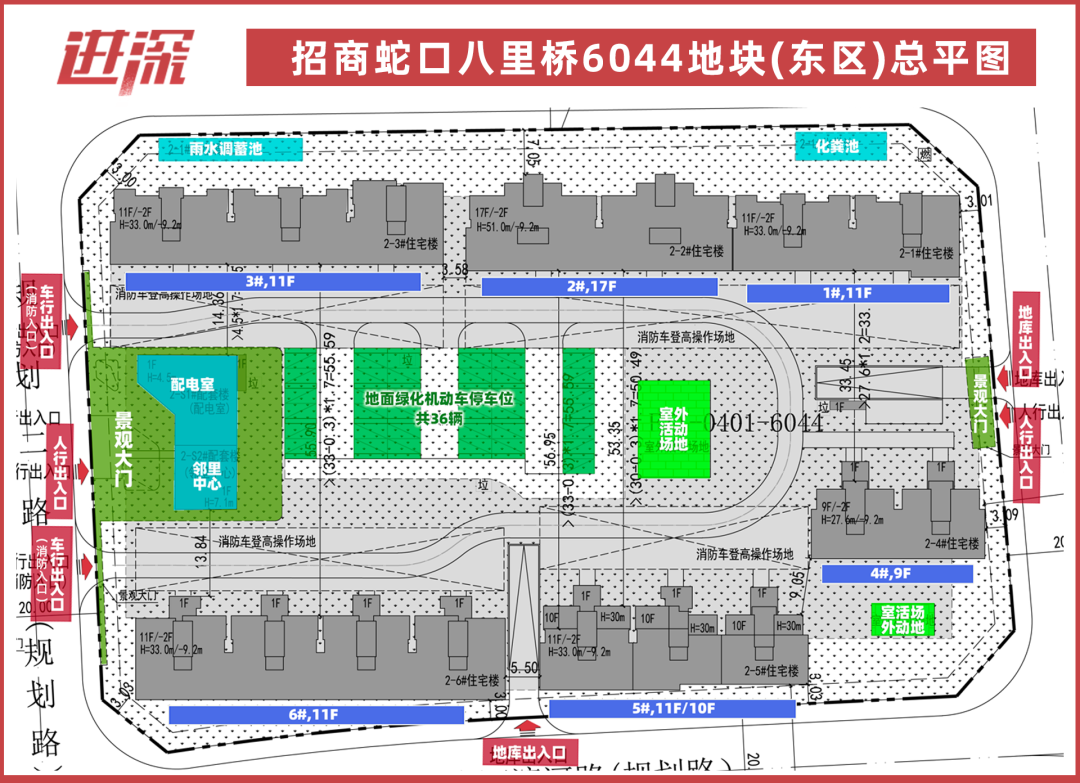 1、东区6044地块占地1.33公顷,地上建面3.33万平方米,规划6栋9-17F住宅,共368户。
