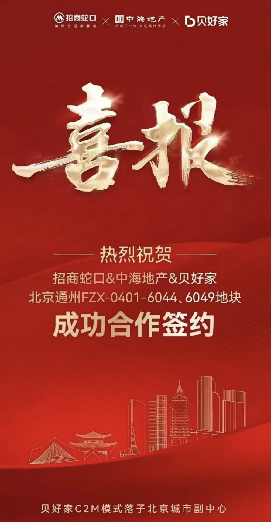 5月30日消息,招商蛇口、中海地产、贝好家正式签约,合作开发通州八里桥新盘朝棠揽阅项目。