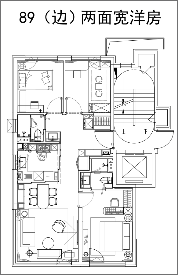 到86户型已经能做到三居两卫,主卧还有个尺度不小的衣帽间。