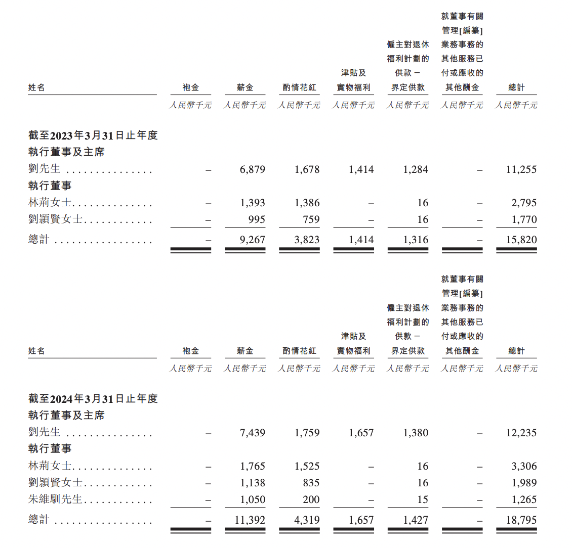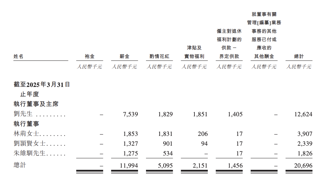 2022财年至2025财年,刘钜荣薪酬总计分别为1125.5万元、1223.5万元及1262.4万元,刘頴贤薪酬总计分别为177万元、198.9万元、233.9万元。
