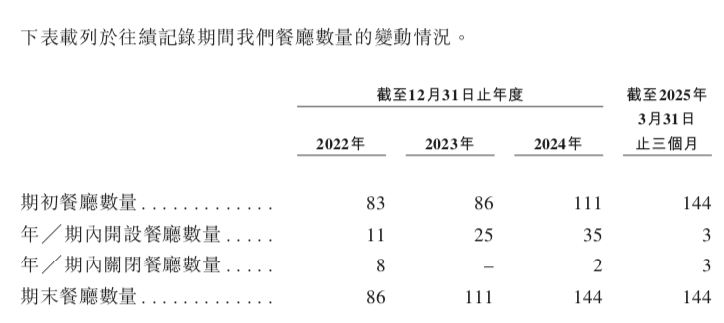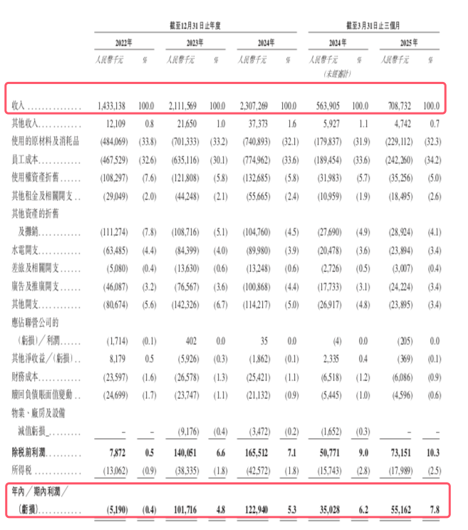 业绩方面,2022年至2024年以及2025年前三个月,巴奴火锅分别实现收入14.33亿元、21.12亿元、23.07亿元及7.09亿元;同期,年内利润分别为-519万元、1.02亿元、1.23亿元以及5516.2万元人民币。