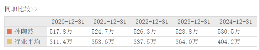 孙陶然担任拉卡拉董事长。2020年-2024年,其获取年薪分别为517.8万元、524.7万元、526.3万元、528.8万元、530.5万元,连年上涨。