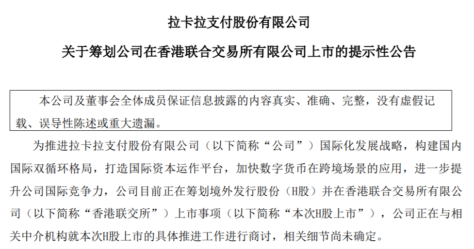 公告显示,为推进拉卡拉国际化发展战略,构建国内国际双循环格局,打造国际资本运作平台,加快数字货币在跨境场景的应用,进一步提升公司国际竞争力,公司目前正在筹划境外发行股份(H股)并在香港联合交易所有限公司上市事项。
