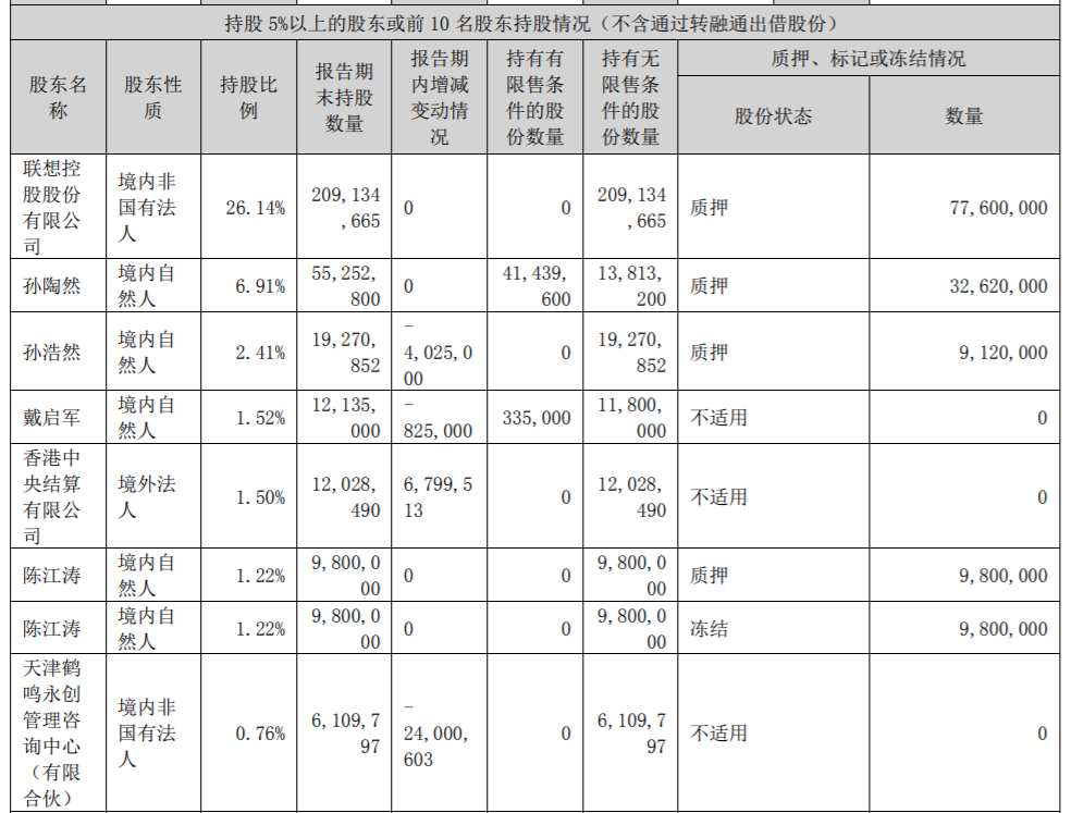 2019年报显示,联想控股持股比例为31.38%。而2024年年报显示,联想控股持股为26.14%,其次为孙陶然持股6.91%,孙浩然持股2.41%。孙陶然与孙浩然是兄弟关系,二人为一致行动人。