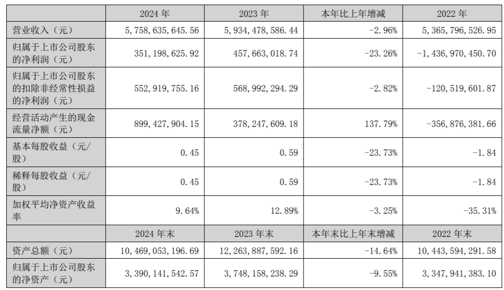 业绩方面,2024年,公司实现营业收入57.59亿元,同比减少2.96%;实现归属母公司股东净利润3.51亿元,同比减少23.26%。
