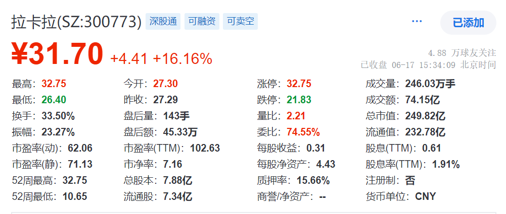 据悉,拉卡拉于2019年4月25日在A股上市,彼时是支付赛道第一股。截至6月17日收盘,其每股收报31.70元,总市值约249.82亿元。