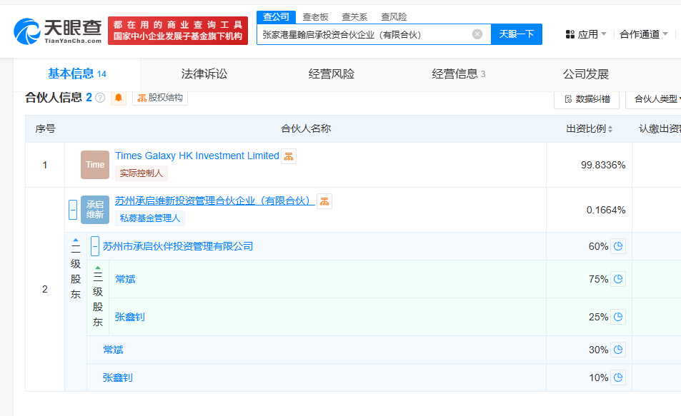 天眼查显示,星翰启承由Times Galaxy HK Investment Limited持股99.8336%,由苏州承启维新投资管理合伙企业(有限合伙)(以下称“承启维新”)持股0.1664%。而承启维新由苏州市承启伙伴投资管理有限公司(以下称“苏州承启”)、常斌、张鑫钊分别持股60%、30%、10%,苏州承启又由常斌、张鑫钊分别持股75%、25%。