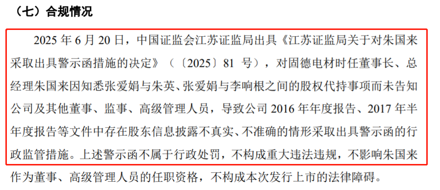 值得注意的是,2025年6月20日,中国证监会江苏证监局出具《江苏证监局关于对朱国来采取出具警示函措施的决定》(〔2025〕81号),对固德电材时任董事长、总经理朱国来因知悉张爱娟与朱英、张爱娟与李响根之间的股权代持事项而未告知公司及其他董事、监事、高级管理人员,导致公司2016年年度报告、2017年半年度报告等文件中存在股东信息披露不真实、不准确的情形采取出具警示函的行政监管措施。