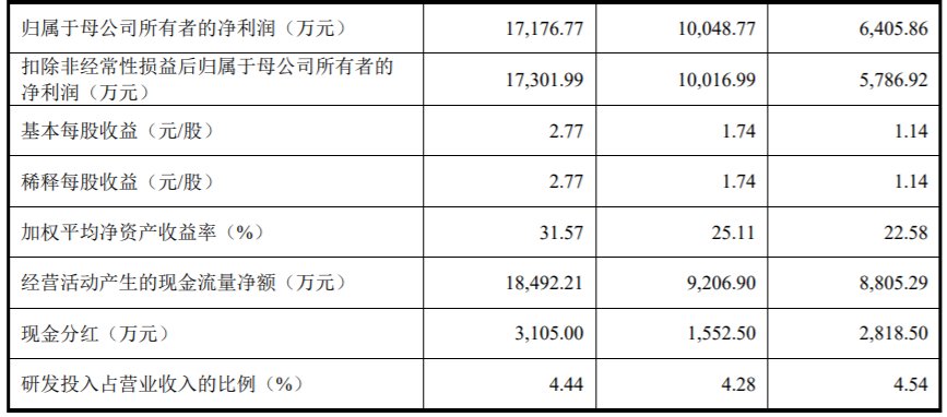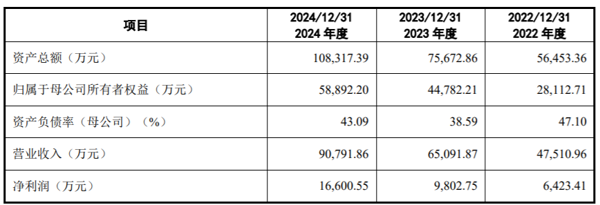 业绩方面,2022年至2024年(报告期内),公司营业收入分别为4.75亿元、6.51亿元和9.08亿元;归属于母公司所有者的净利润分别为0.64亿元、1.00亿元和1.72亿元。2024年,公司营收净利双增。