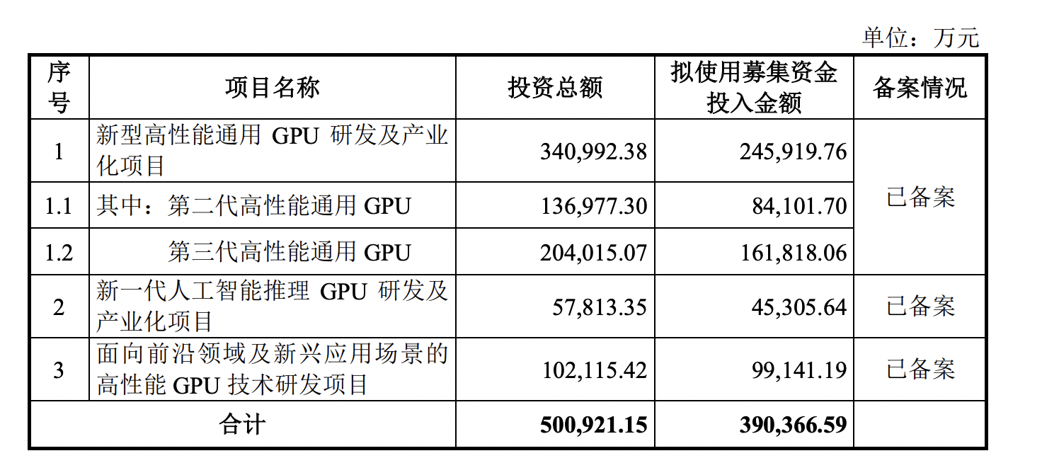 本次IPO,沐曦股份拟募集资金39.04亿元,其中,24.59亿元用于新型高性能通用GPU研发及产业化项目,4.5亿元用于新一代人工智能推理GPU研发及产业化项目,9.91亿元用于面向前沿领域及新兴应用场景的高性能GPU技术研发项目。