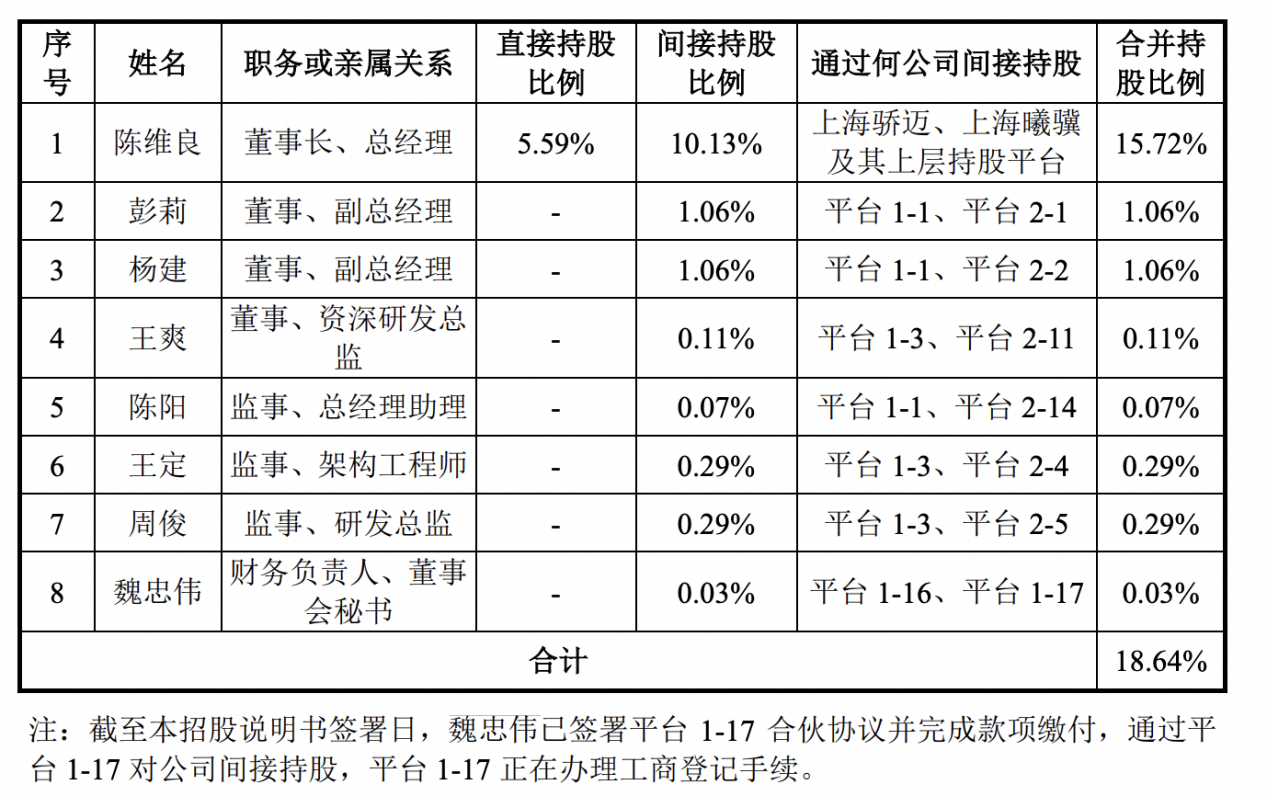 IPO前,沐曦股份创始人陈维良通过直接持股及控制上海骄迈、上海曦骥,合计控制公司22.94%的股份表决权(公司其他股东持股比例较为分散),并且拥有公司董事会除独立董事之外半数以上成员提名权,为公司的实际控制人。此外,公司联合创始人彭莉、杨建分别间接持股1.06%。