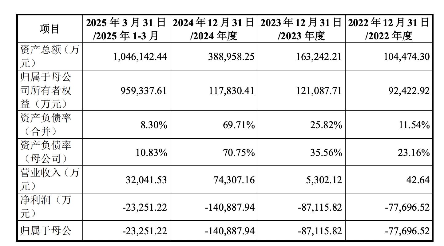 2022年至2024年及2025年一季度,沐曦股份营业收入分别为42.64万元、5302.12万元、7.43亿元、3.2亿元,归母净亏损分别为7.77亿元、8.71亿元、14.09亿元、2.33亿元,尚未实现盈利。