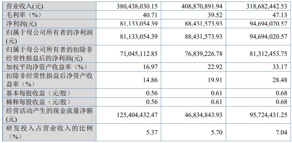 业绩方面,2022年至2024年,公司实现营业收入分别为3.19亿元、4.09亿元和3.80亿元;净利润分别为9469.40万元、8843.16万元及8113.31万元。