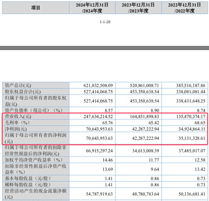 业绩方面,2022年至2024年,公司营业收入分别为1.35亿元、1.65亿元、2.48亿元;归属于母公司所有者的净利润分别为3513.13万元、4228.72万元、7064.40万元。业绩快速提升。