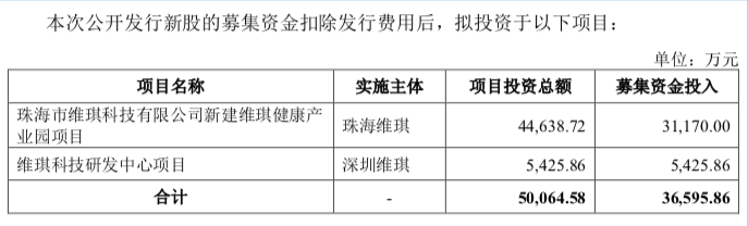 维琪科技本次拟募资3.66亿元,用于珠海市维琪科技有限公司新建维琪健康产业园项目以及维琪科技研发中心项目。