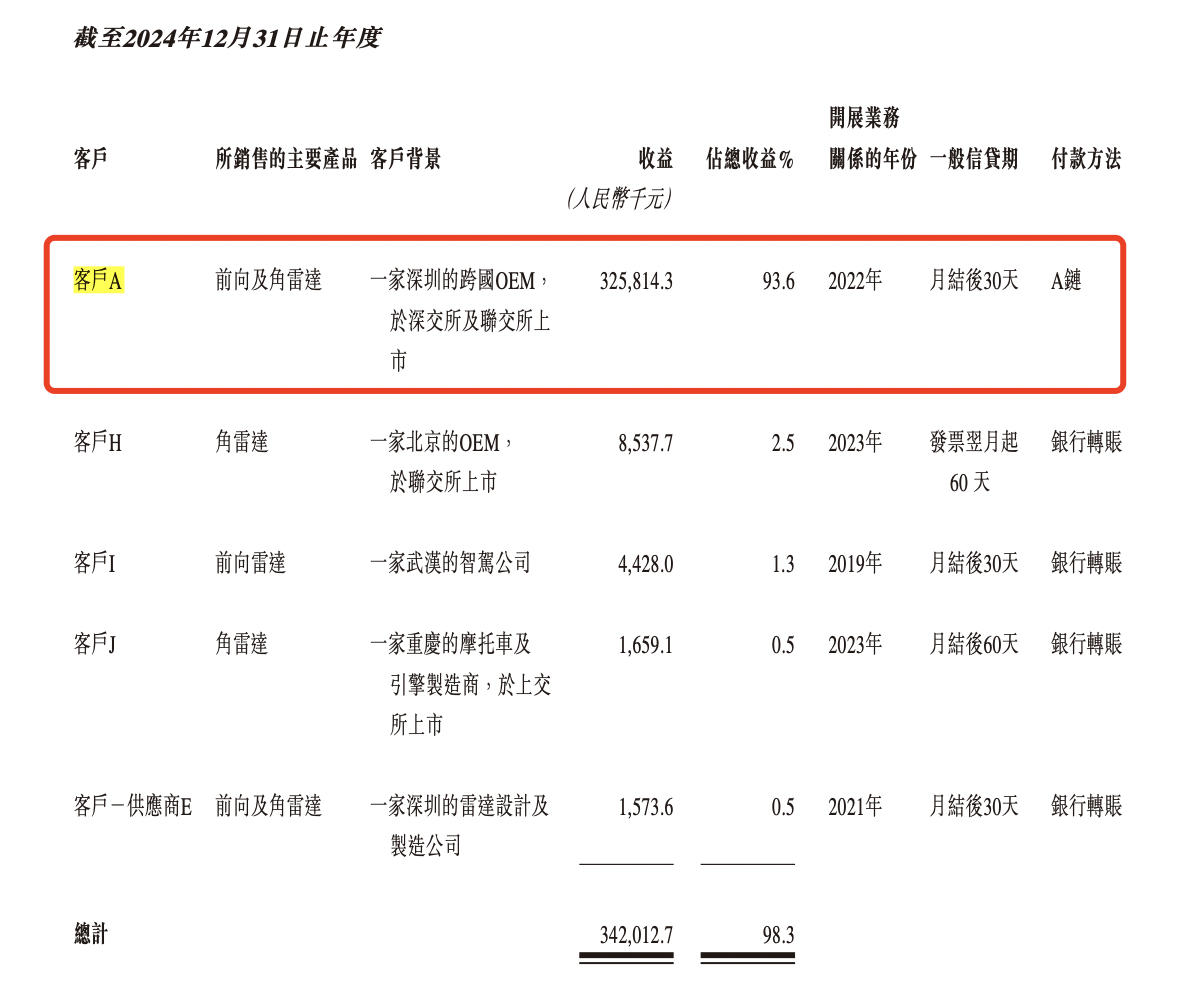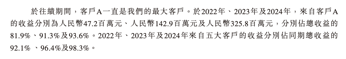 值得注意的是,于往绩期间,客户A一直是公司的最大客户。于2022年、2023年及2024年,来自客户A的收益分别为4720万元、1.43亿元及3.26亿元,分别占总收益的81.9%、91.3%及93.6%。