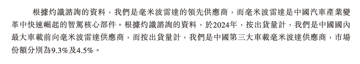 根据灼识谘询的资料,于2024年,按出货量计,承泰科技是中国国内最大车载前向毫米波雷达供应商,而按出货量计,其是中国第三大车载毫米波达供应商,市场份额分别为9.3%及4.5%。