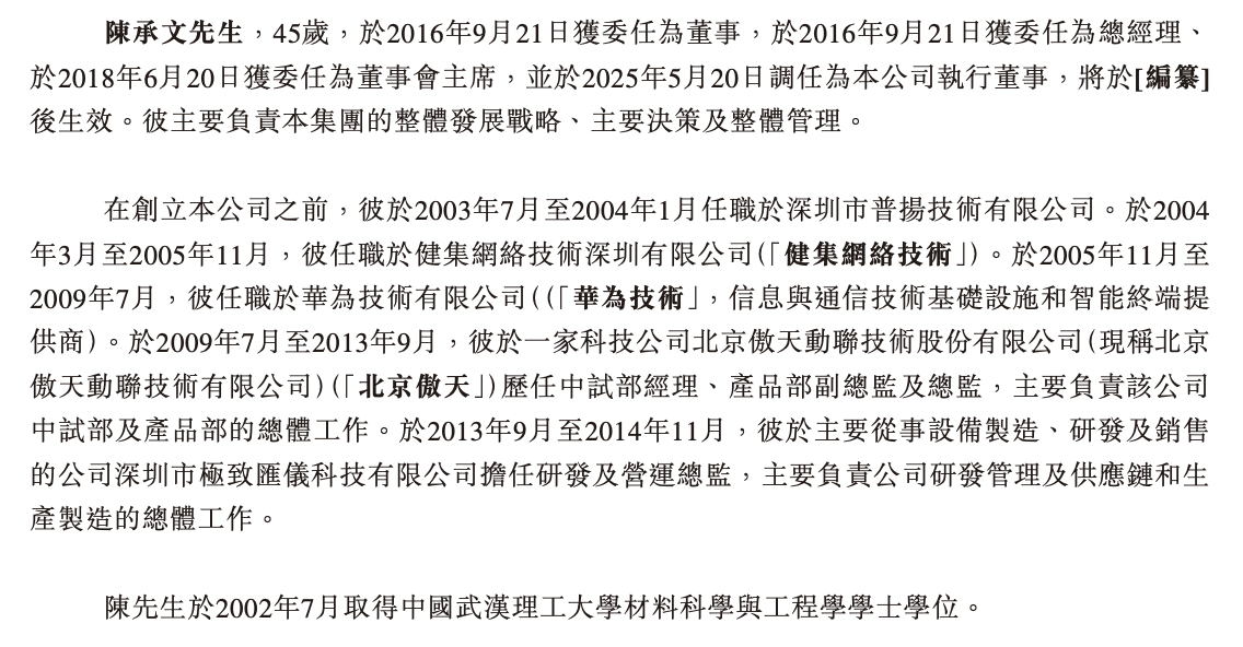 陈承文,45岁,于2016年9月21日获委任为董事,于2016年9月21日获委任为总经理、于2018年6月20日获委任为董事会主席,并于2025年5月20日调任为公司执行董事。其主要负责本集团的整体发展战略、主要决策及整体管理。
