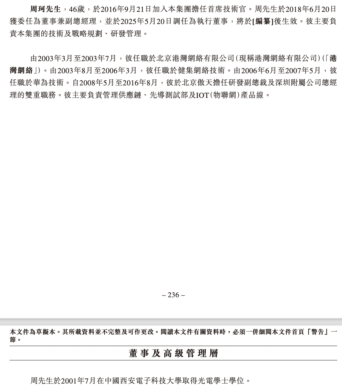 周珂,46岁,于2016年9月21日加入集团担任首席技术官。周珂于2018年6月20日获委任为董事兼副总经理,并于2025年5月20日调任为执行董事。其主要负责集团的技术及战略规划、研发管理。
