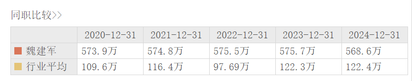 2020年至2024年,魏建军薪酬分别为573.9万元、574.8万元、575.5万元、575.7万元及568.6万元。2024年,其薪酬微降。