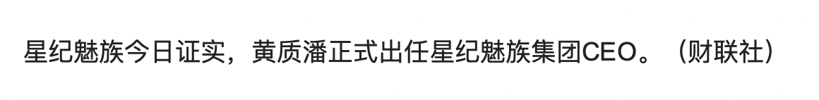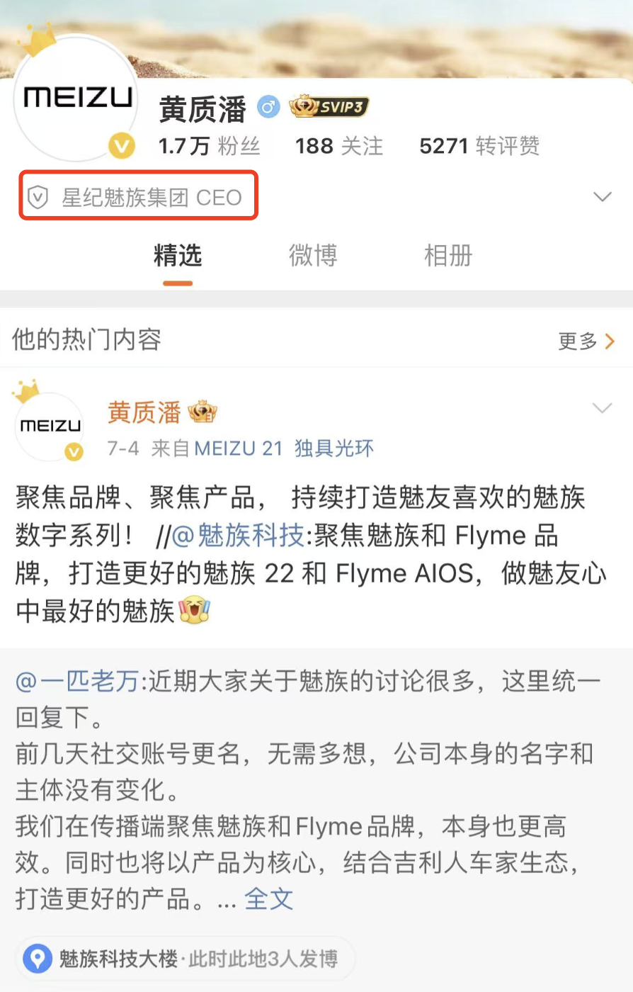 与此同时,黄质潘的微博认证已经更新为星纪魅族集团CEO,此前他的身份为星纪魅族集团手机产品线总裁。
