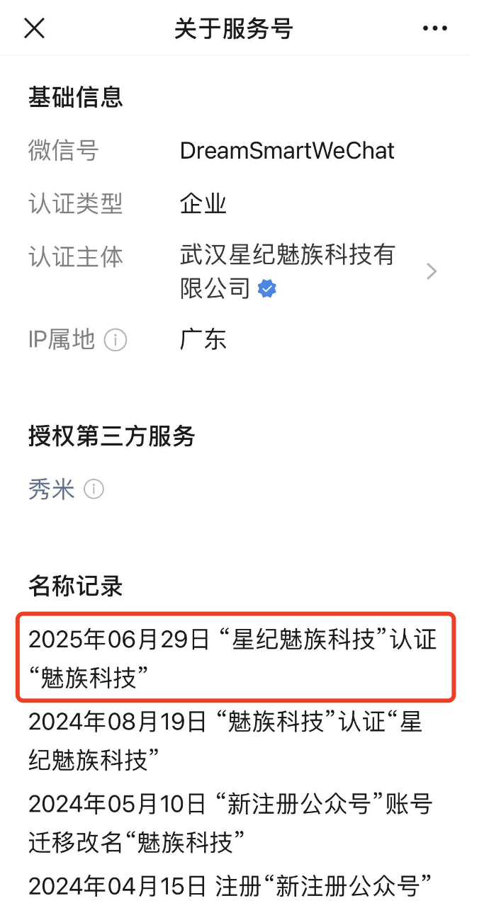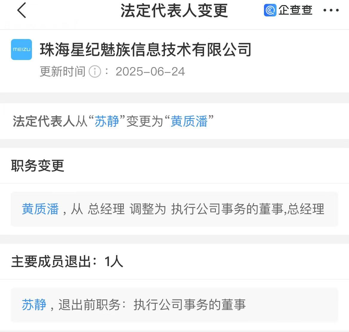 值得注意的是,今年6月24日,珠海星纪魅族信息技术有限公司法定代表人由苏静变更为黄质潘。6月29日,公众号“星纪魅族科技”也更名为“魅族科技”。
