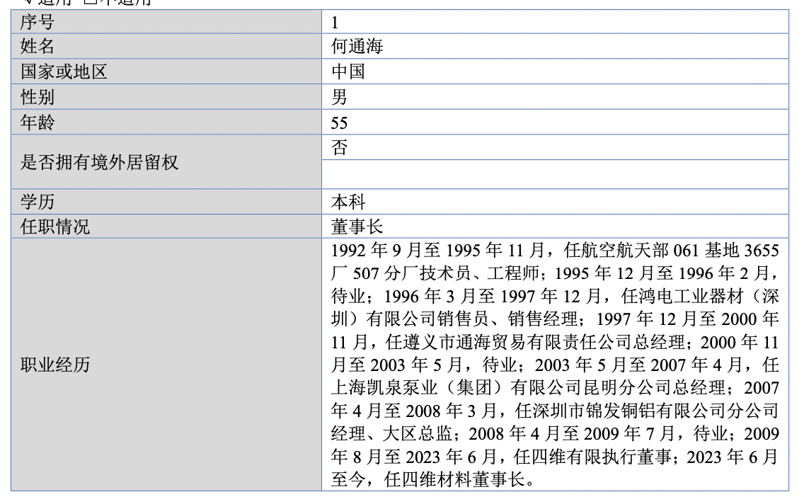 公开资料显示,何通海,55岁,本科学历,其于1992年9月至1995年11月,任航空航天部061基地3655厂507分厂技术员、工程师;1995年12月至1996年2月,待业;1996年3月至1997年12月,任鸿电工业器材(深圳)有限公司销售员、销售经理;1997年12月至2000年11月,任遵义市通海贸易有限责任公司总经理;2000年11月至2003年5月,待业;2003年5月至2007年4月,任上海凯泉泵业(集团)有限公司昆明分公司总经理;2007年4月至2008年3月,任深圳市锦发铜铝有限公司分公司经理、大区总监;2008年4月至2009年7月,待业;2009年8月至2023年6月,任四维有限执行董事;2023年6月至今,任四维材料董事长。