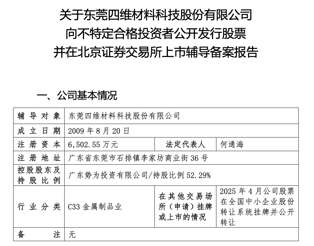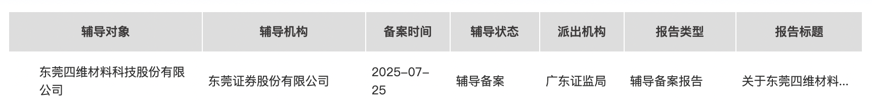 瑞财经 吴文婷 近日,东莞四维材料科技股份有限公司(以下简称“四维材料”)启动IPO辅导,拟冲击北交所,辅导机构为东莞证券股份有限公司(以下简称“东莞证券”) ,律师事务所为北京国枫律师事务所(以下简称“国枫律师”) ,会计师事务所为立信会计师事务所(特殊普通合伙)(以下简称“立信会计师”) 。