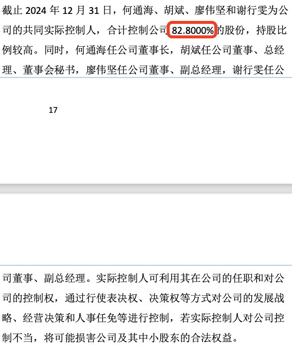 截止2024年12月31日,何通海、胡斌、廖伟坚和谢行雯为公 司的共同实际控制人,合计控制公司82.8%的股份。同时,何通海任公司董事长,胡斌任公司董事、总经理、董事会秘书,廖伟坚任公司董事、副总经理,谢行雯任公司董事、副总经理。