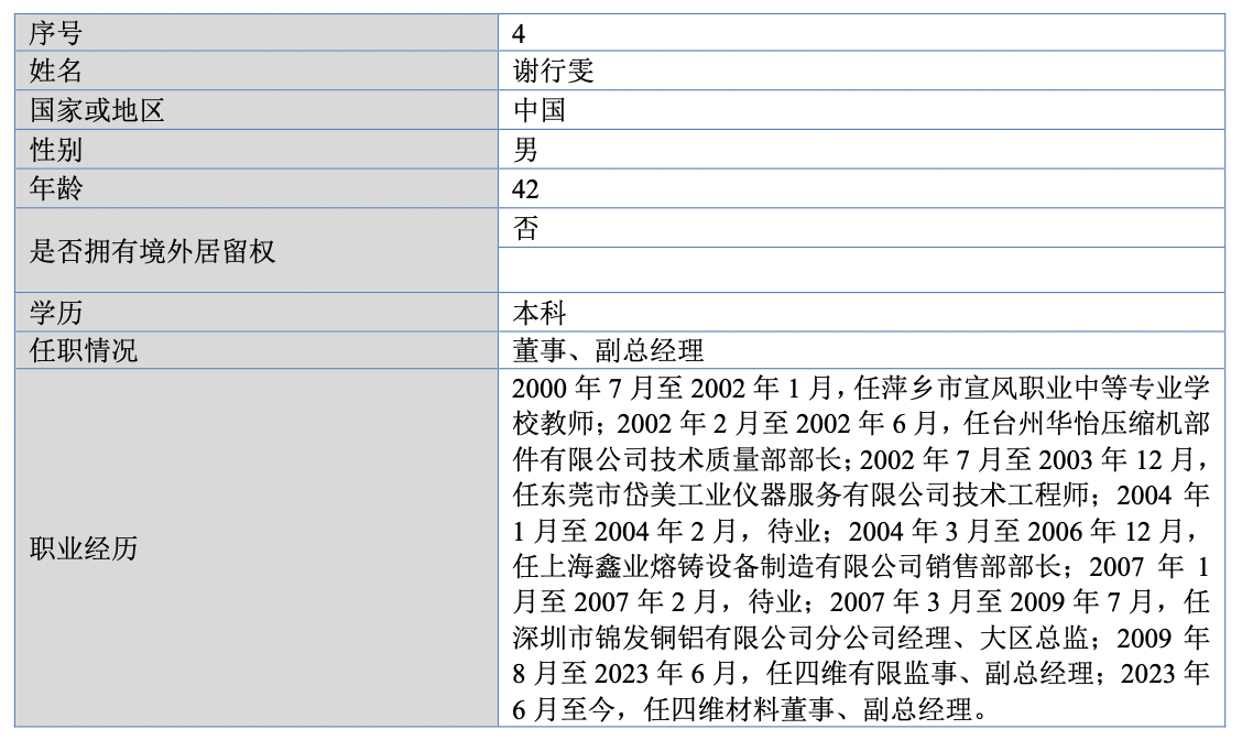 谢行雯,42岁,本科学历,2000年7月至2002年1月,任萍乡市宣风职业中等专业学校教师;2002年2月至2002年6月,任台州华怡压缩机部件有限公司技术质量部部长;2002年7月至2003年12月,任东莞市岱美工业仪器服务有限公司技术工程师;2004年1月至2004年2月,待业;2004年3月至2006年12月,任上海鑫业熔铸设备制造有限公司销售部部长;2007年1月至2007年2月,待业;2007年3月至2009年7月,任深圳市锦发铜铝有限公司分公司经理、大区总监;2009年8月至2023年6月,任四维有限监事、副总经理;2023年6月至今,任四维材料董事、副总经理。