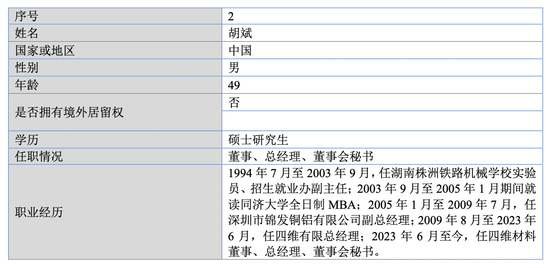 胡斌,49岁,硕士研究生学历,其于1994年7月至2003年9月,任湖南株洲铁路机械学校实验员、招生就业办副主任;2003年9月至2005年1月期间就读同济大学全日制MBA;2005年1月至2009年7月,任深圳市锦发铜铝有限公司副总经理;2009年8月至2023年6月,任四维有限总经理;2023年6月至今,任四维材料董事、总经理、董事会秘书。