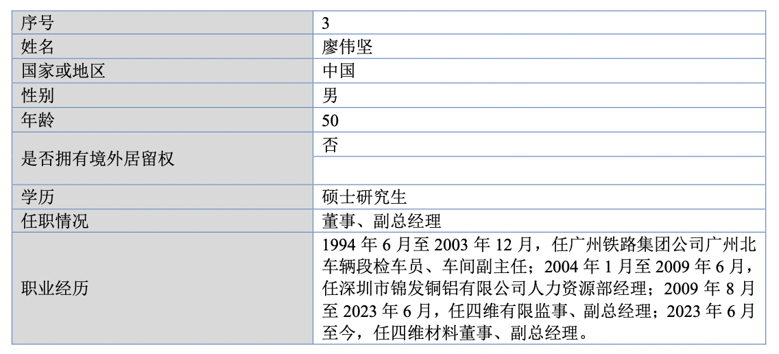 廖伟坚,50岁,硕士研究生学历,其于1994年6月至2003年12月,任广州铁路集团公司广州北车辆段检车员、车间副主任;2004年1月至2009年6月,任深圳市锦发铜铝有限公司人力资源部经理;2009年8月至2023年6月,任四维有限监事、副总经理;2023年6月至今,任四维材料董事、副总经理。