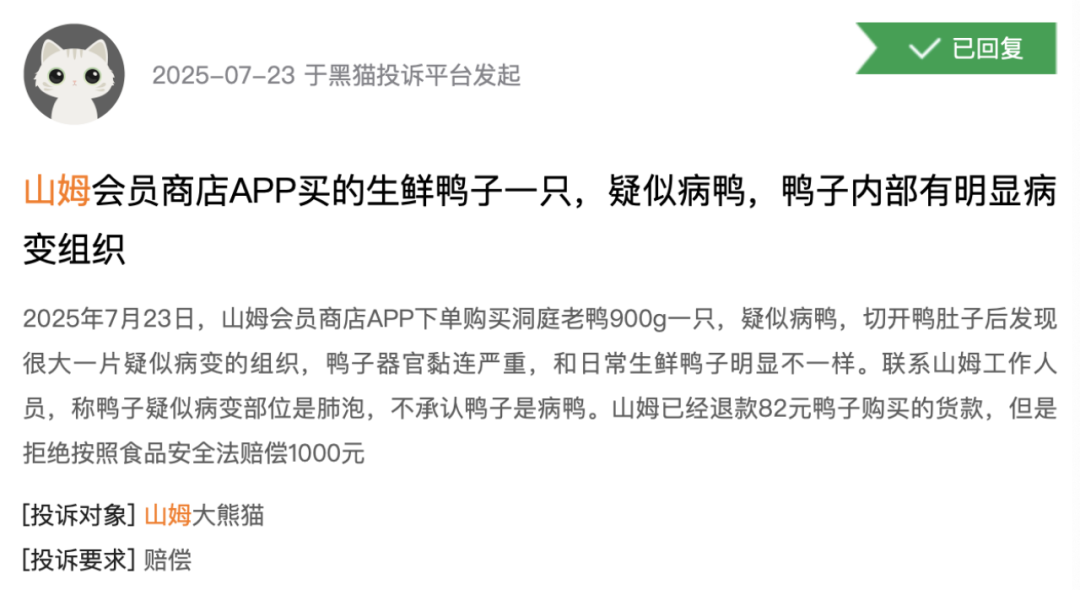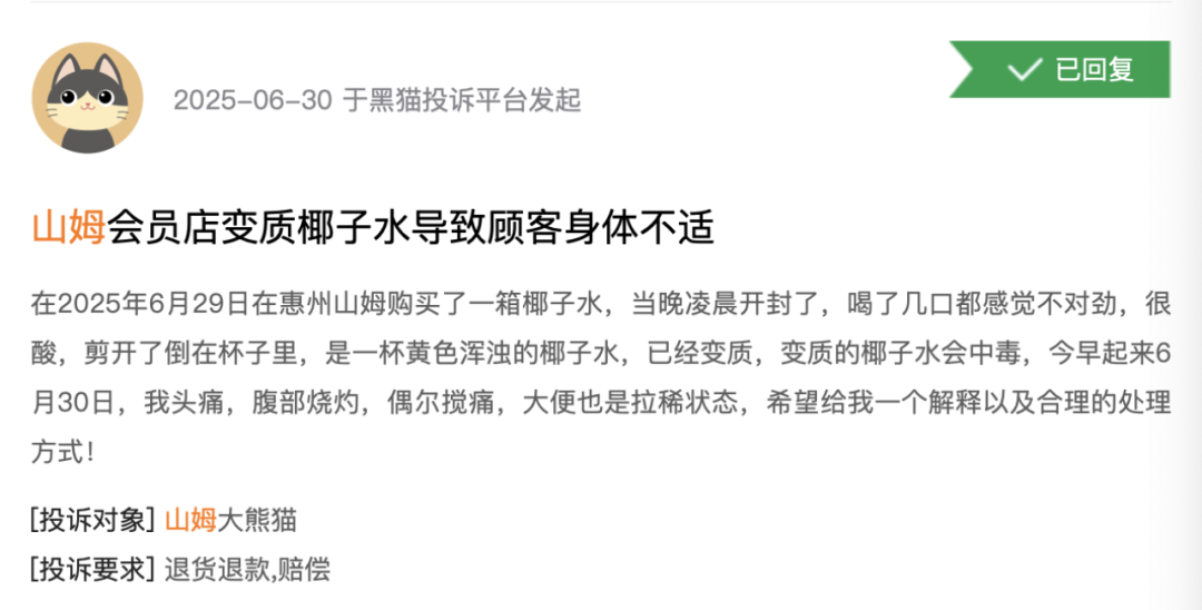 黑猫投诉平台显示,目前,关于山姆的投诉多达1.17万条,相关投诉包括侵犯会员卡权益、椰子水变质、生鲜鸭子疑似病变、售后态度差等等。2024年,山姆在黑猫投诉平台的相关投诉量同比增长65%。