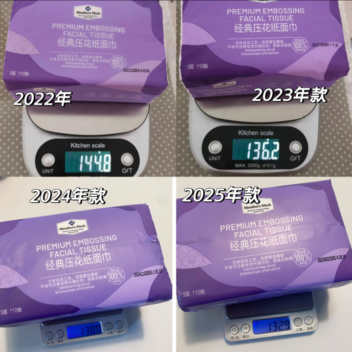 还有细心的网友发现山姆一款经典紫色纸巾3年来价格没变,重量却每年都在“悄悄”缩水。从2022年的144.8g/包降低至今年的132.9g/包,降幅约8.2%,且纸张又薄又软。还指出山姆蓝色小包抽纸、洗脸巾、保鲜膜等也都被发现质量变差,偷偷减重等问题。