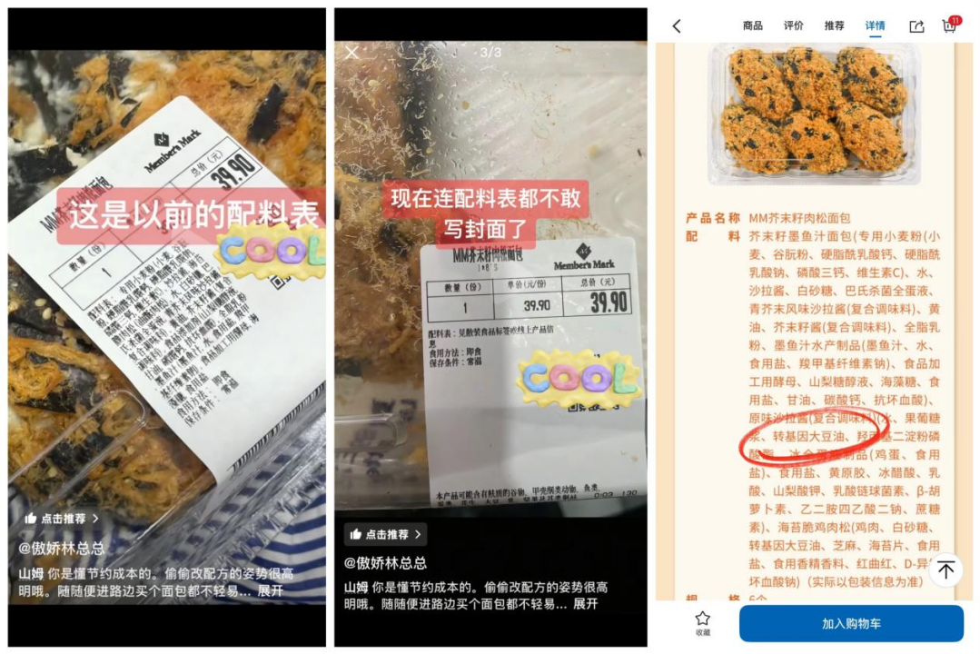 好丽友风波只是开始。7月21日,有网友发帖称,山姆MM芥味籽肉松面包的外包装不再印配料表,仅标注“详见散装标签或线上信息”。线上版本赫然写着“转基因大豆油”,而此前线下同款却没有这一项。