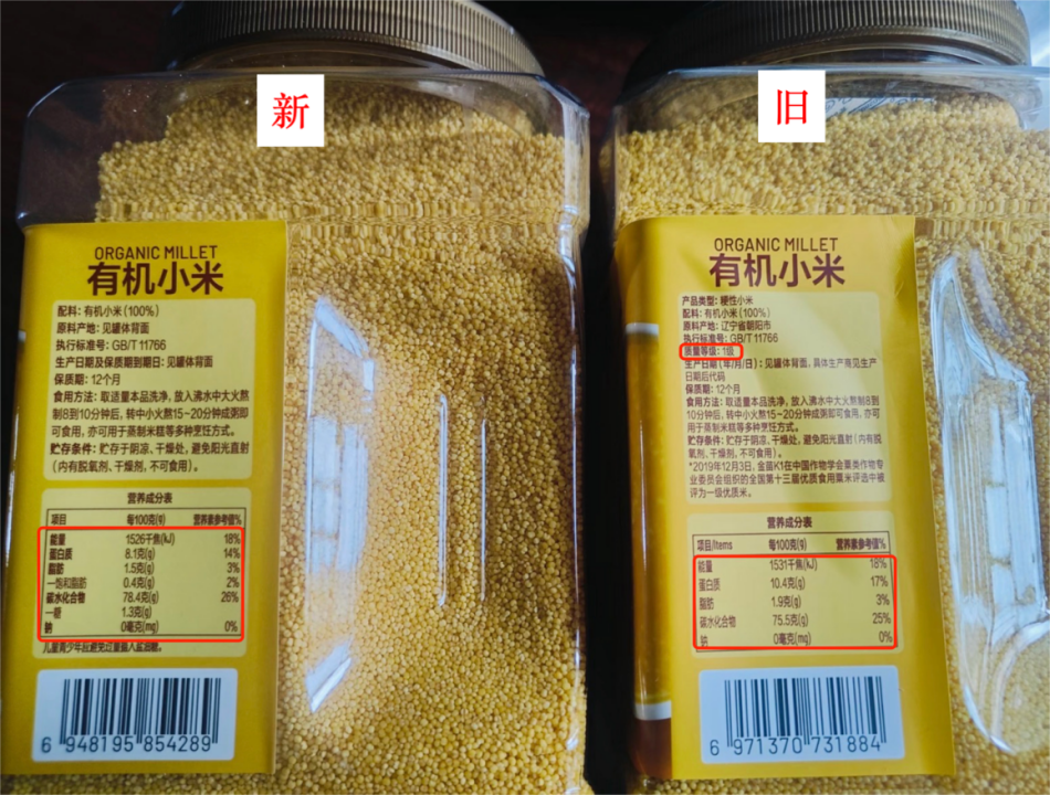 网友在山姆新买的2罐小米,一罐有标注1级,而另一罐不显示等级。不仅如此,新旧产品营养成分也不同,未标注等级的小米每100克蛋白质含量从10.4克降至8.1克,足足降低22%,同时碳水化合物含量上涨3.84%。也就是说,吃同一碗小米粥,不仅从中摄取的营养减少,还更容易胖了。