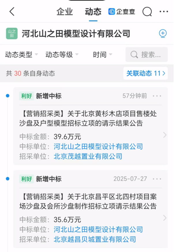 值得一提的,这家公司7月27日还有一则中标公告,为昌平北四村项目案场及会所沙盘,中标金额35.6万元。