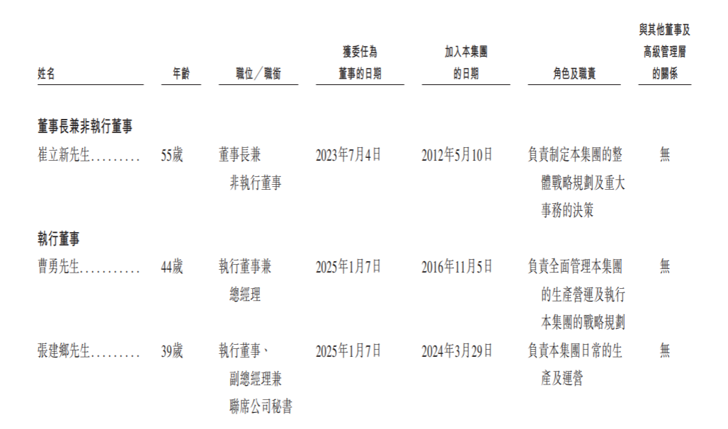 曹勇,44岁,于2025年1月7日获委任为公司执行董事兼总经理。主要负责全面管理本集团的生产营运及执行集团的战略规划。