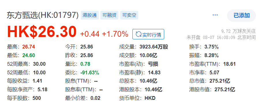 瑞财经 赵盼盼 8月7日,东方甄选(1797.HK)股价低开高走。截至收盘,报收26.3港元/股,涨幅1.7%,总市值275.21亿港元。
