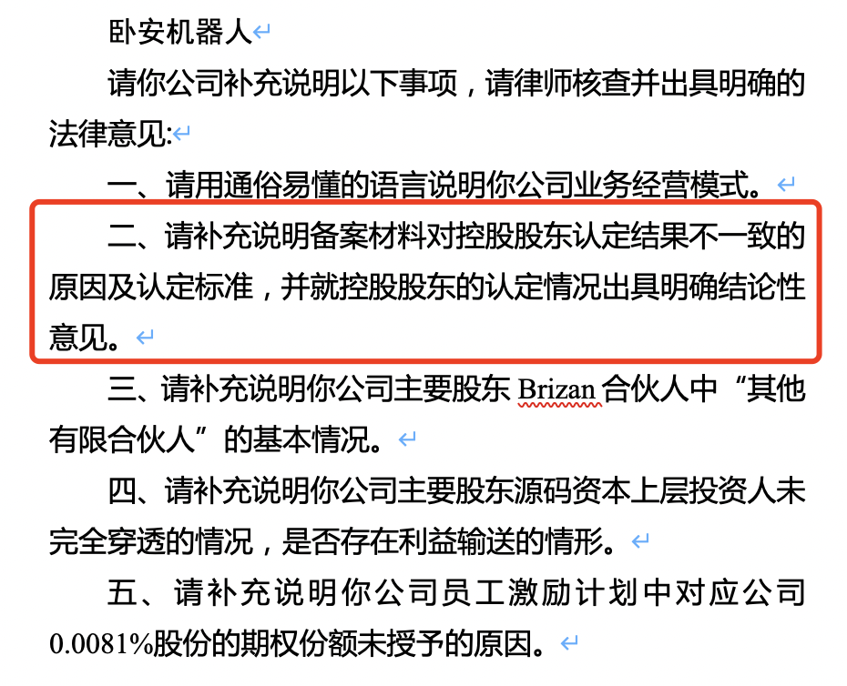 证监会要求卧安机器人,用通俗易懂的语言说明公司业务经营模式;补充说明备案材料对控股股东认定结果不一致的原因及认定标准,并就控股股东的认定情况出具明确结论性意见等。